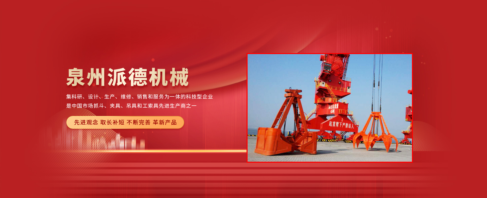 泉州派德機(jī)械有限公司成立于2012年5月,位于全國(guó)文明的古城福建泉州,公司擁有各類(lèi)型專業(yè)員工82人,其中高級(jí)工程師1人,工程師4人,助理工程師5人,是一家集科研、設(shè)計(jì)、生產(chǎn)、維修、銷(xiāo)售和服務(wù)為一體的科技型企業(yè),是中國(guó)市場(chǎng)抓斗、夾具、吊具和工索具先進(jìn)生產(chǎn)商之一。產(chǎn)品采用國(guó)內(nèi)外先進(jìn)的設(shè)計(jì)方案、技術(shù)規(guī)范、制造過(guò)程、工藝流程和服務(wù),憑借在抓斗、夾具、吊具和工索具領(lǐng)域的超前設(shè)計(jì)理念和成熟的技術(shù)、工藝和管理,在抓具領(lǐng)域迅速崛起。